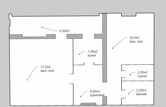 Квартира состоит из: двух жилых комнат площадью 17,5 кв.м. и 10,5 кв.м., кухни площадью 7,5 кв.м., просторной прихожей площадью 8,5 кв.м., с/у площадью 1 кв.м, ванной площадью 2 кв.м., лоджии площадью 6.3 кв.м.